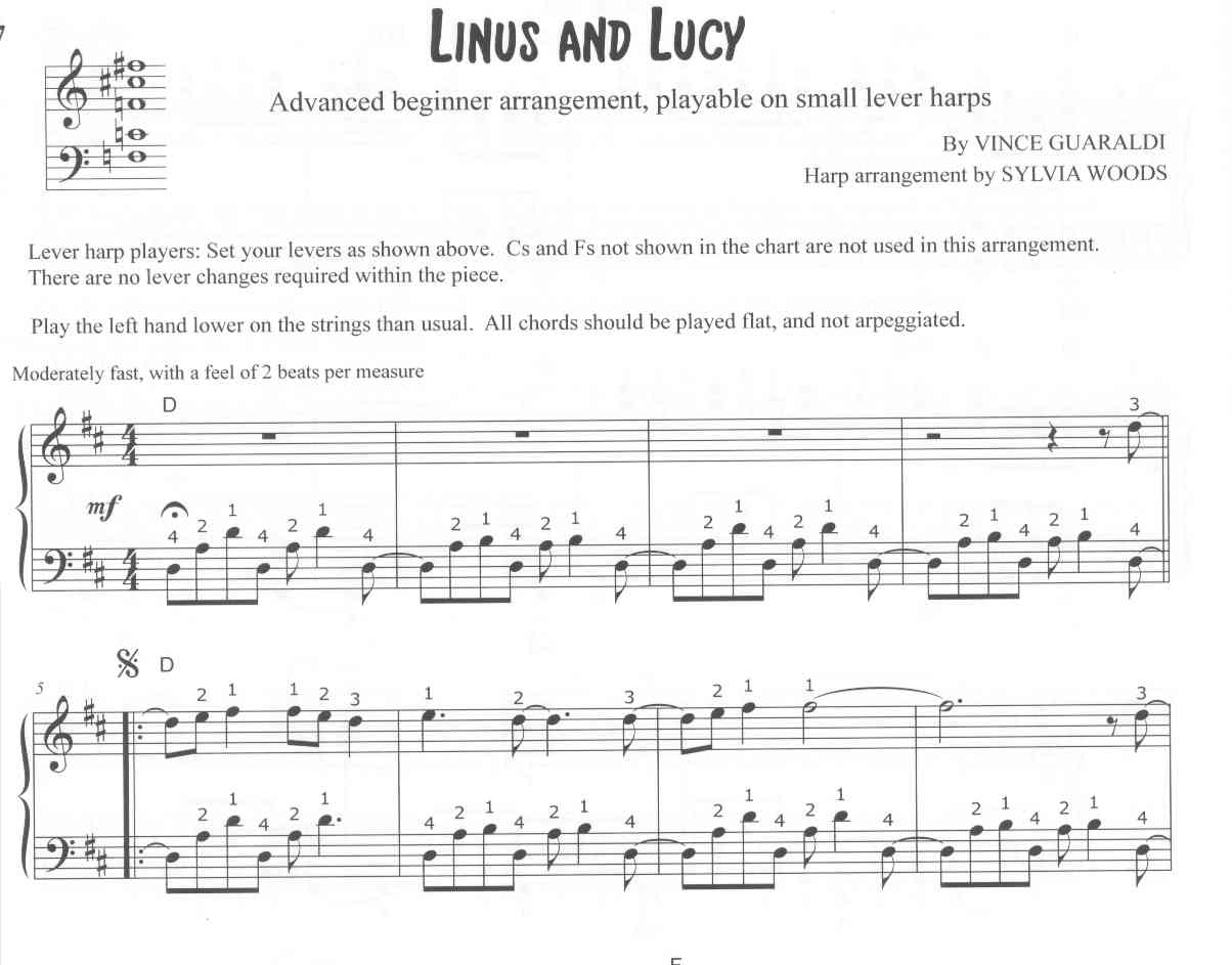 There are 2 arrangements of Linus and Lucy included. Once you set select C and F sharping levers at the beginning, there are no lever changes needed in either version. The intermediate arrangement includes 2-note chords in the right hand. The easier arrangement has the main melody as single notes. The left hand is basically the same in both arrangements, except that the easier version is written an octave higher so it can be played on smaller harps. Fingerings, chord symbols, and lever and pedal changes are included.