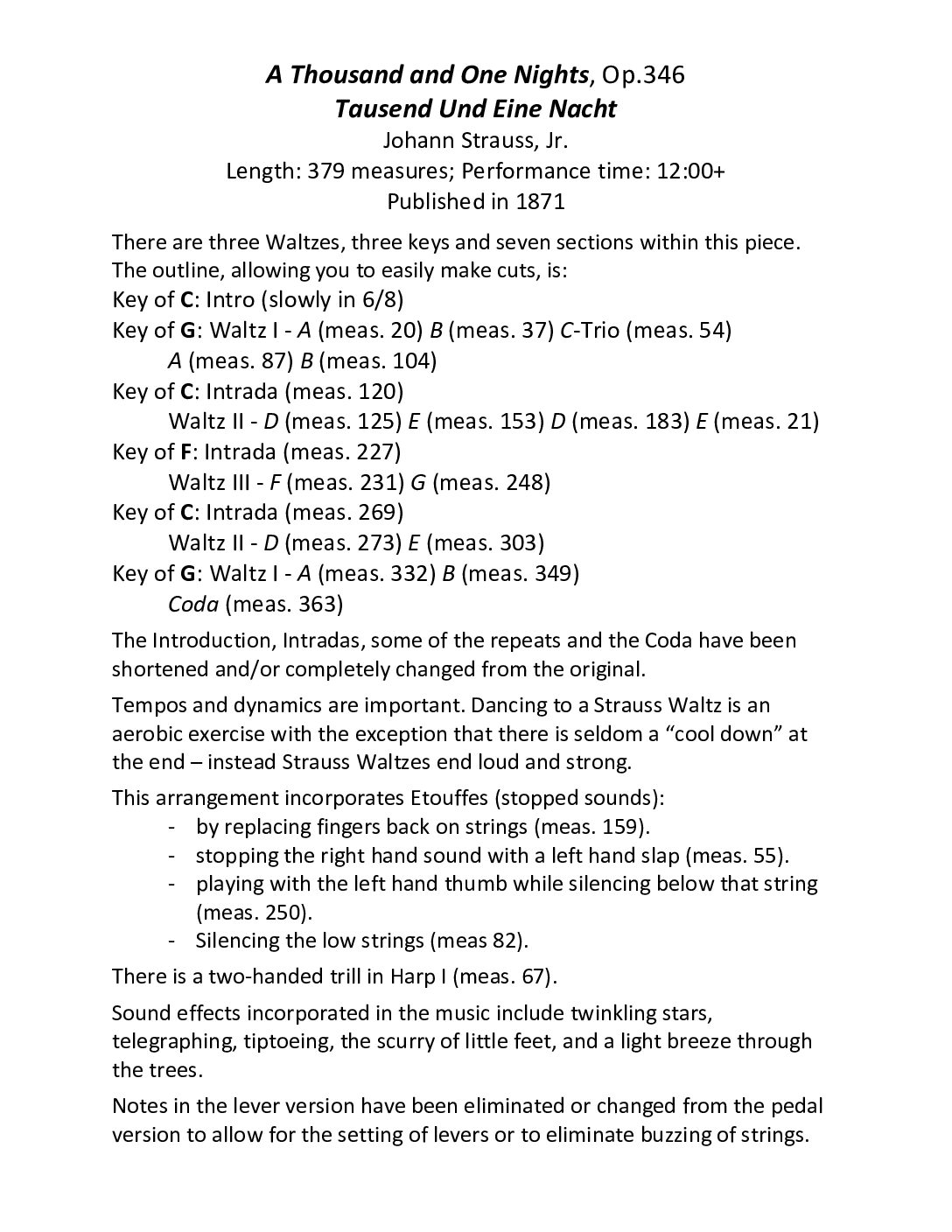 The pedal and lever harp duet versions are not exactly the same, although they are intended to be played together. They differ in the pedal/lever markings, harmony notes and which harp is playing the melody note. The dynamics and Waltz sections are clearly marked. Pedal Harp Score & Parts, 54 pages.