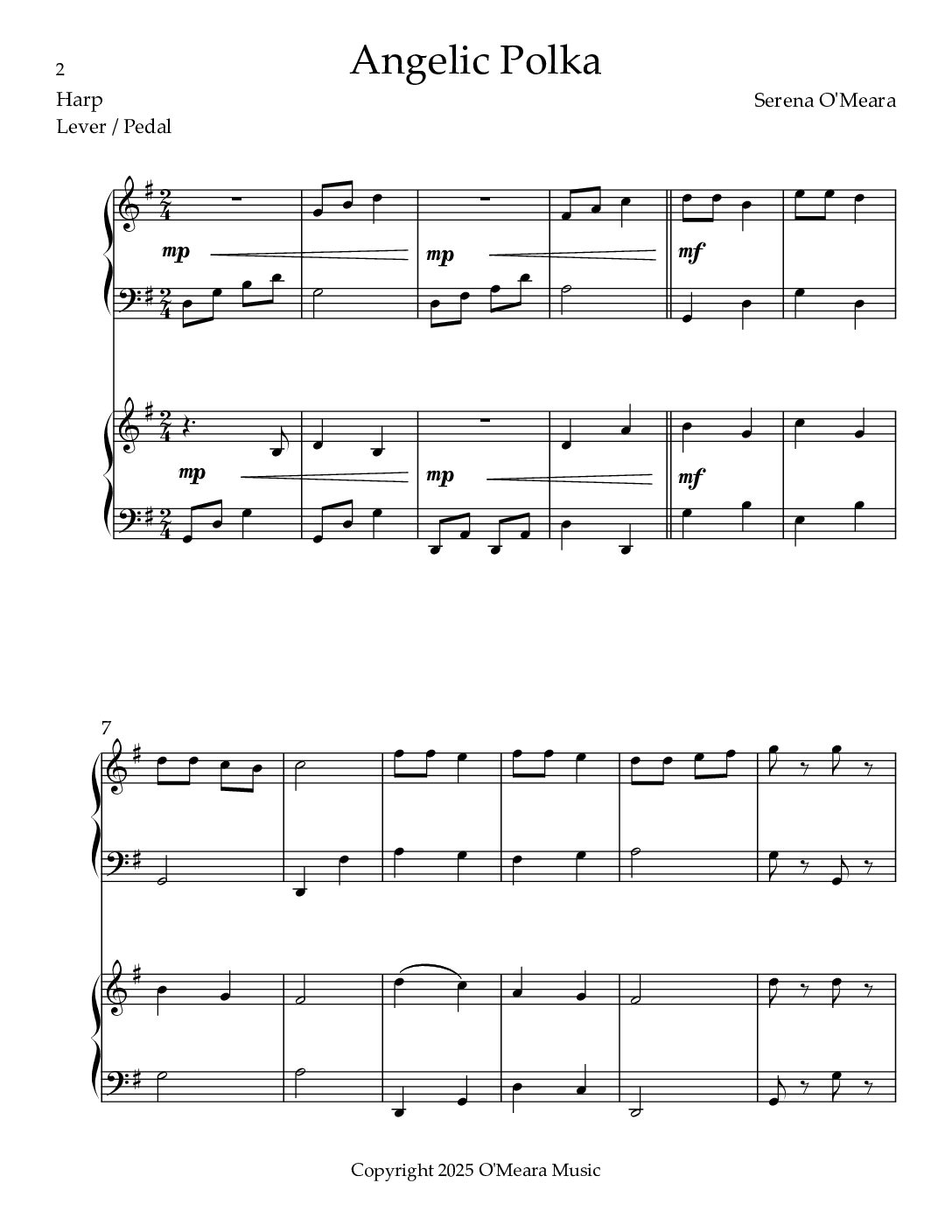 This is an 8 bar, rhythmically fun, dance melody with variations for an early intermediate harp ensemble. The melody is shared equally between parts. Thumb slides, accents & dynamics are included. It is arranged for Lever or Pedal Harps. Score & Parts, 13 pages.