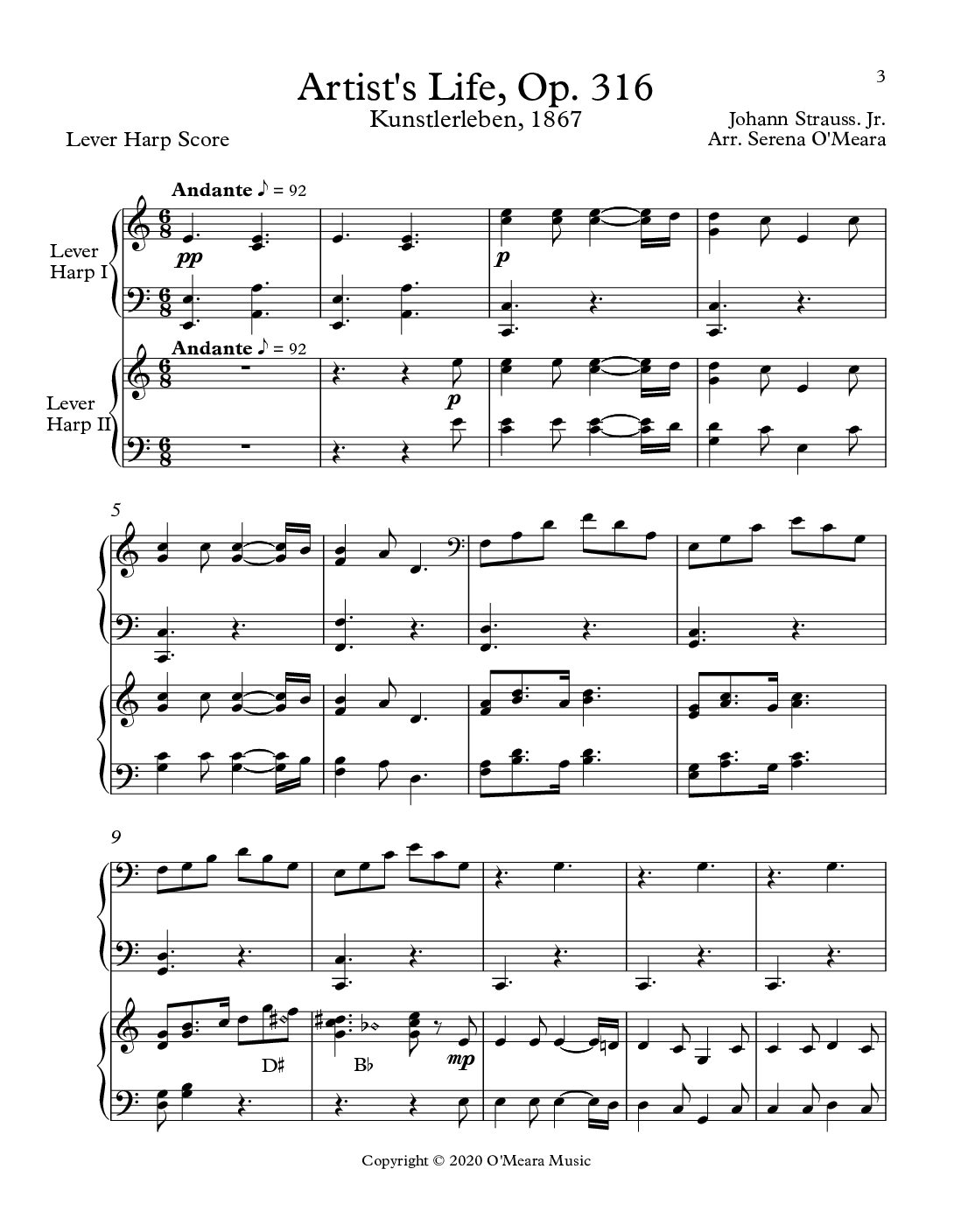 This arrangement has four out of five of the original Waltzes with all the Waltzes and sections marked to make creating a shorter version easier. It has both a pedal harp and lever harp version that is intended to be performed together. They only differ in the pedal/lever markings and an occasional harmony note. The dynamics are clearly marked. Lever Score & Parts, 62 pages.