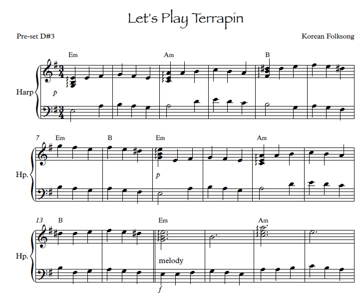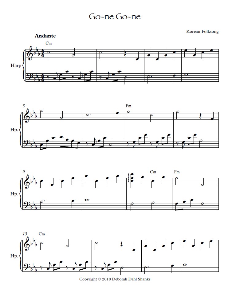 “Asian Folksongs for the Small Harp contains 22 folk songs from Korea, Mongolia, Taiwan, the Philippines and various Chinese Provinces arranged in a style that remains true to the Asian sound while utilizing the character of the harp. The arrangements are appropriate for a small lever harp with 1 octave below middle C and tuned to Eb or C. Songs in two keys are noted with an * in Contents. All arrangements are very accessible for a mid-beginner to intermediate level player with limited or easy lever changes.”
