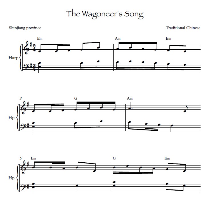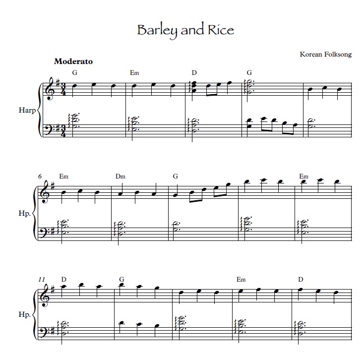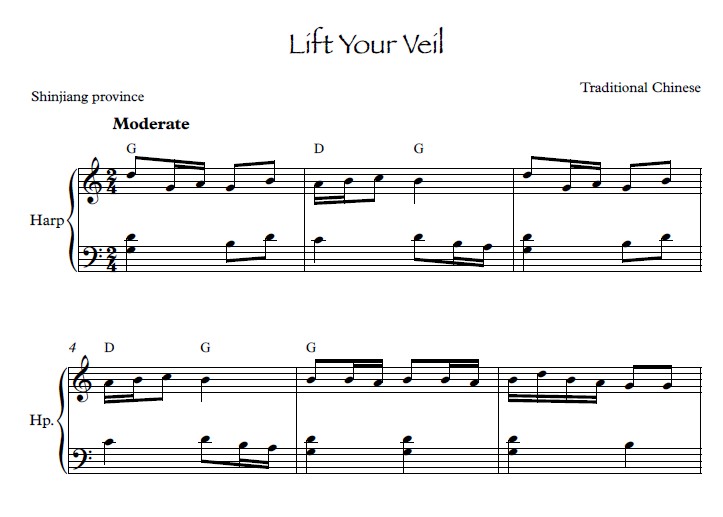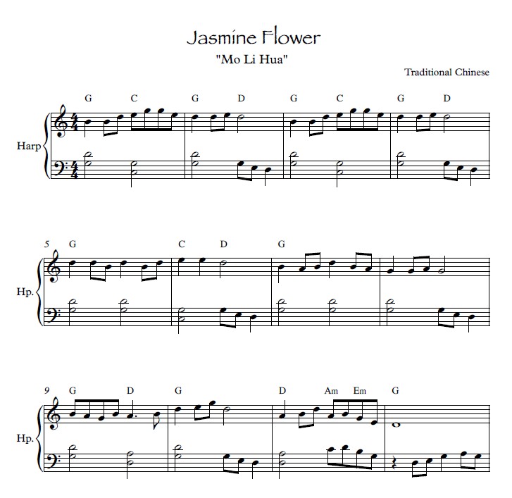 Asian Folksongs for Small Harps in C contains 22 folk songs from Korea, Mongolia, Taiwan, the Philippines and various Chinese Provinces arranged in a style that remains true to the Asian sound while utilizing the character of the harp.  The arrangements are appropriate for a small harp without levers and with 20-22 strings (starting with G below middle C) or 26 strings (starting one octave below middle C) and tuned in C.  All arrangements are very accessible for a mid-beginner to intermediate level player without levers.”
