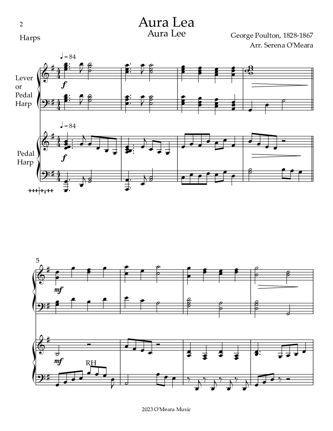 Harp I is playable on either Lever or Pedal Harps. Harp II is for Pedal Harp. The melody is evenly divided between parts. Score & Parts, 20 pages.
