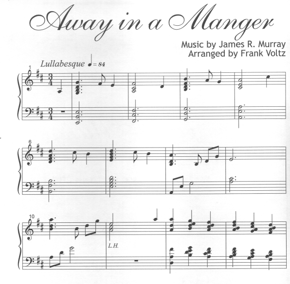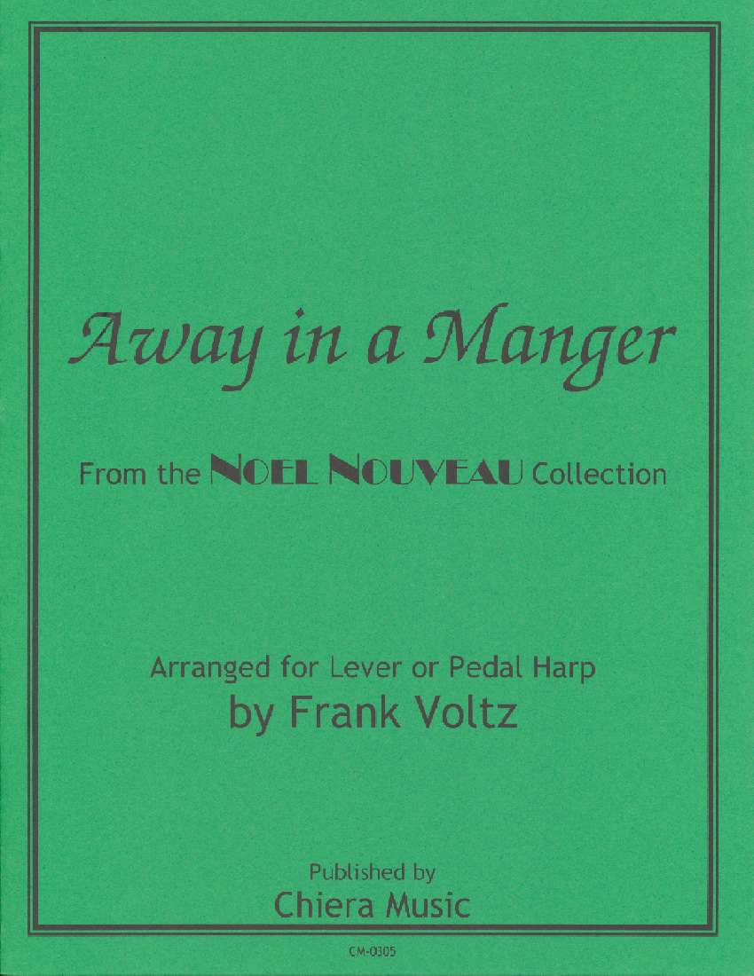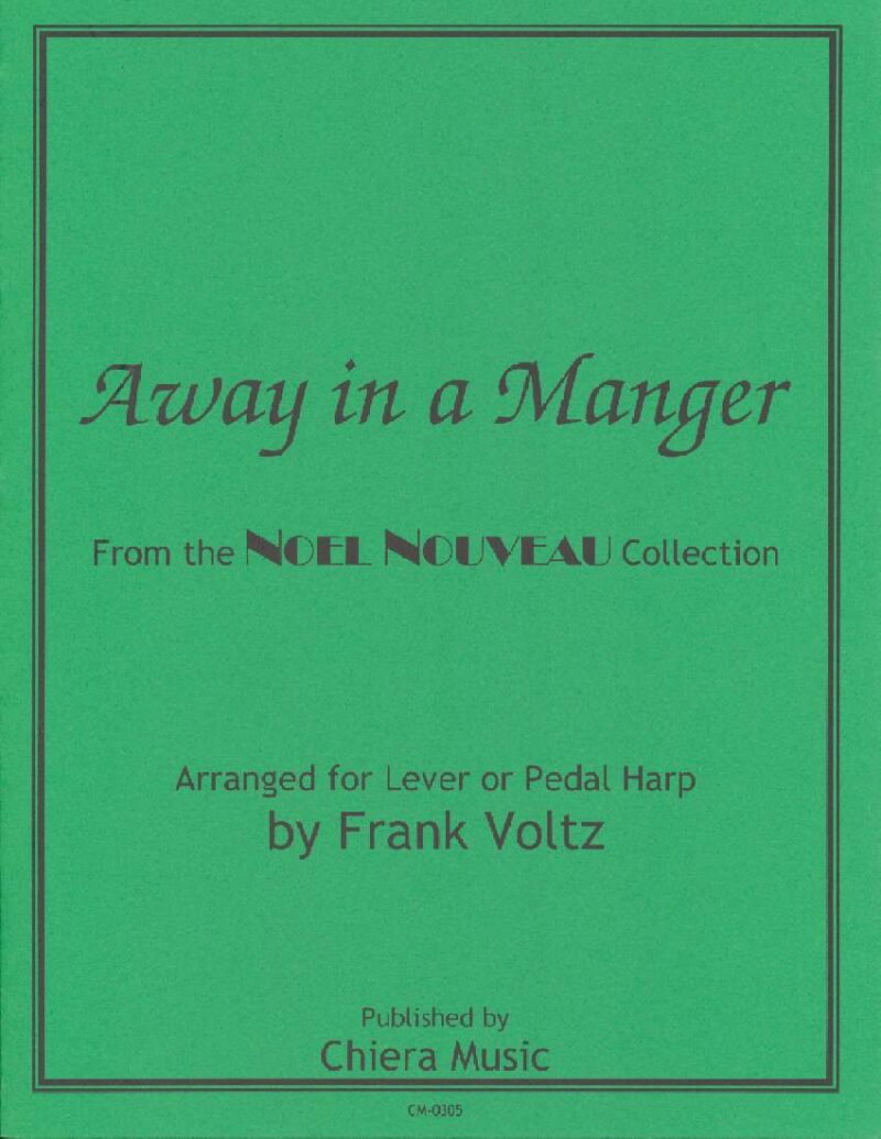 Frank published the original version of Away in a Manger in 2001. He has rearranged it and included more jazz chords, changed the key to D major so it can be played on lever harps tuned in C and Eb, created a new introduction, embellished the existing arrangement, and created a new more Frank ending. INTERMEDIATE, ALL HARPS.