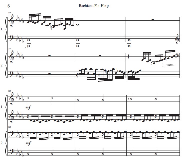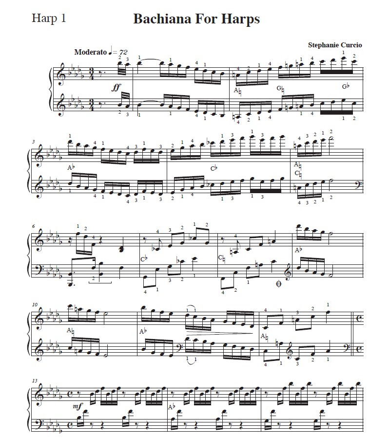 This is a fabulous duet for intermediate to advanced pedal harp players. The piece is filled with pedal changes and a variety of rhythms. It has five flats. The harp 1 and harp 2 trade the melody and 16th/32nd note runs making it a very interesting piece. A classically-minded audience will enjoy the intricate weave of favorite Bach works – Toccata in D Minor, Prelude in C Major, Arioso, and more. Included are a score (6 pages) and separate parts (3 pages each). LATE INTERMEDIATE/EARLY ADVANCED, PEDAL HARP DUET.