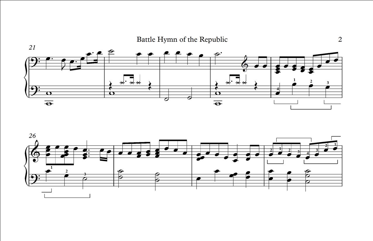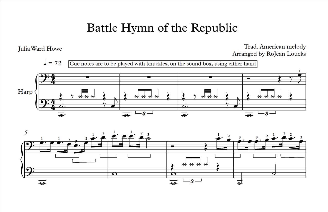Beloved patriotic tune with lyrics penned during the American Civil War. Known outside the U.S. as “Mine Eyes Have Seen the Glory.” Arranged as two verses; the first one is majestic and percussive while the second is more lyrical and melodic. Key of C with no lever changes. Some fingerings are given. ALL HARPS, INTERMEDIATE.