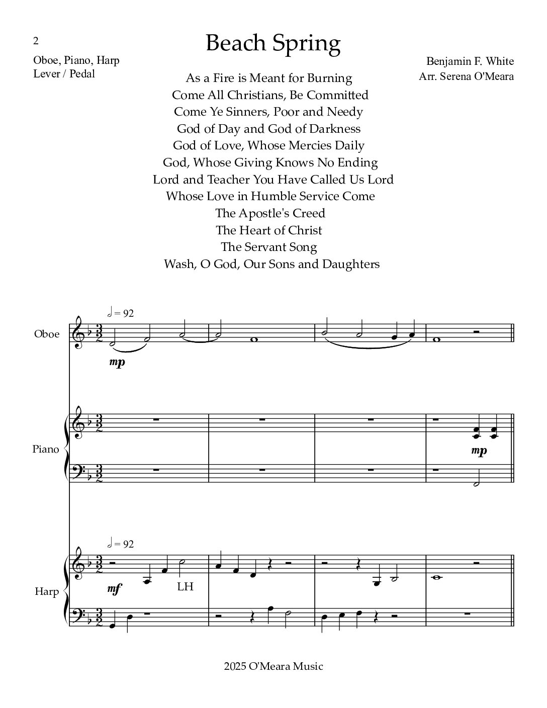 A meditative trio arrangement of the 1844 hymn tune Beach Spring. The harp part is playable on either Lever or Pedal Harps. Score & Parts, 17 pages.