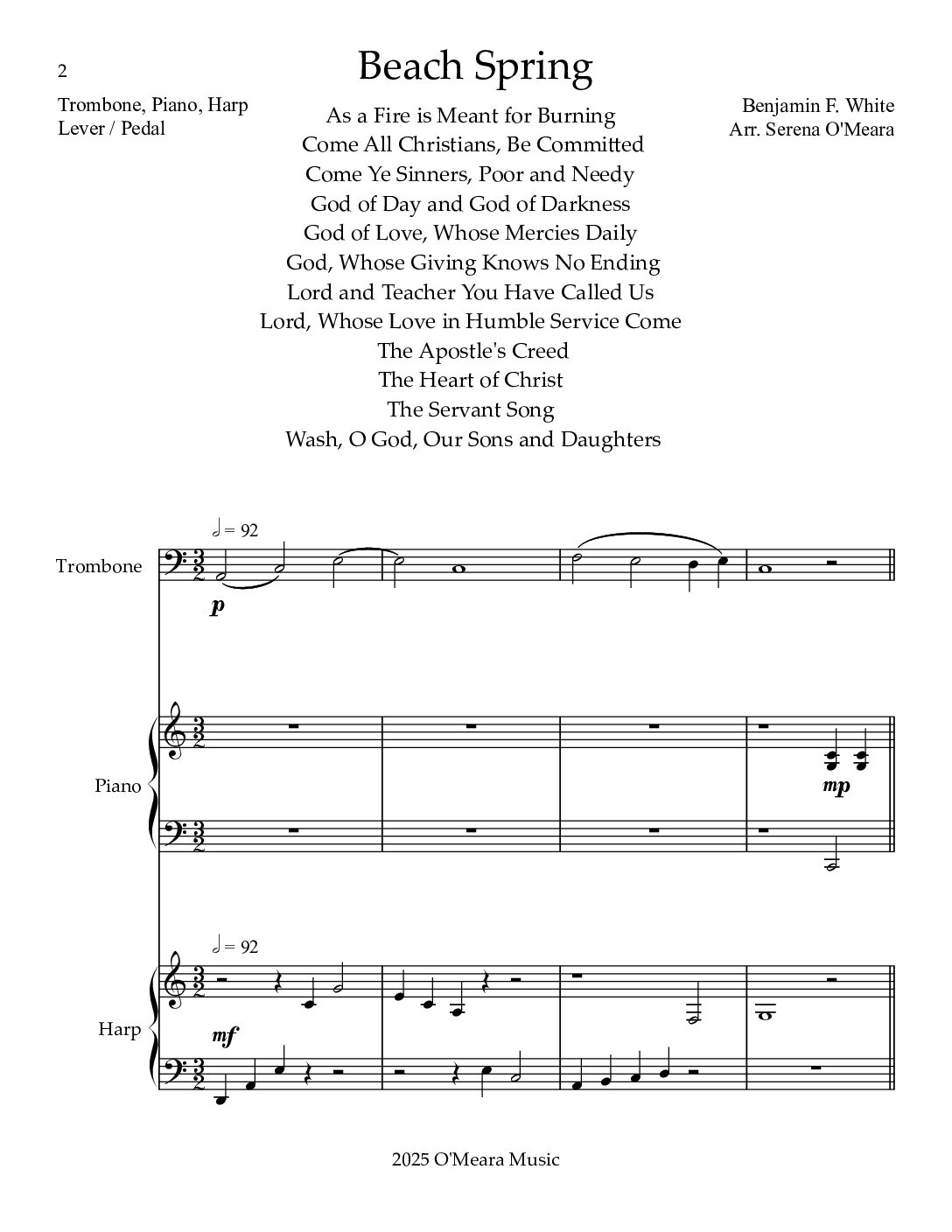 A meditative trio arrangement of the 1844 hymn tune Beach Spring. The harp part is playable on either Lever or Pedal Harps. Score & Parts, 17 pages.