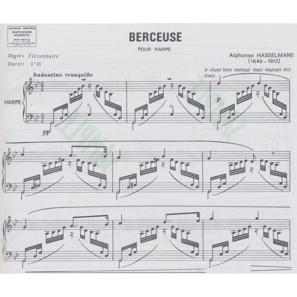 Eight-page pedal harp solo written by Alphonse Hasselmans (1845-1912). Key of Gm and full of arpeggios. Page 4 begins a con moto section in Eb major, page 6 returns to G minor. Pedal changes are not marked, intermediate pedal harp repertoire. INTERMEDIATE PEDAL HARP