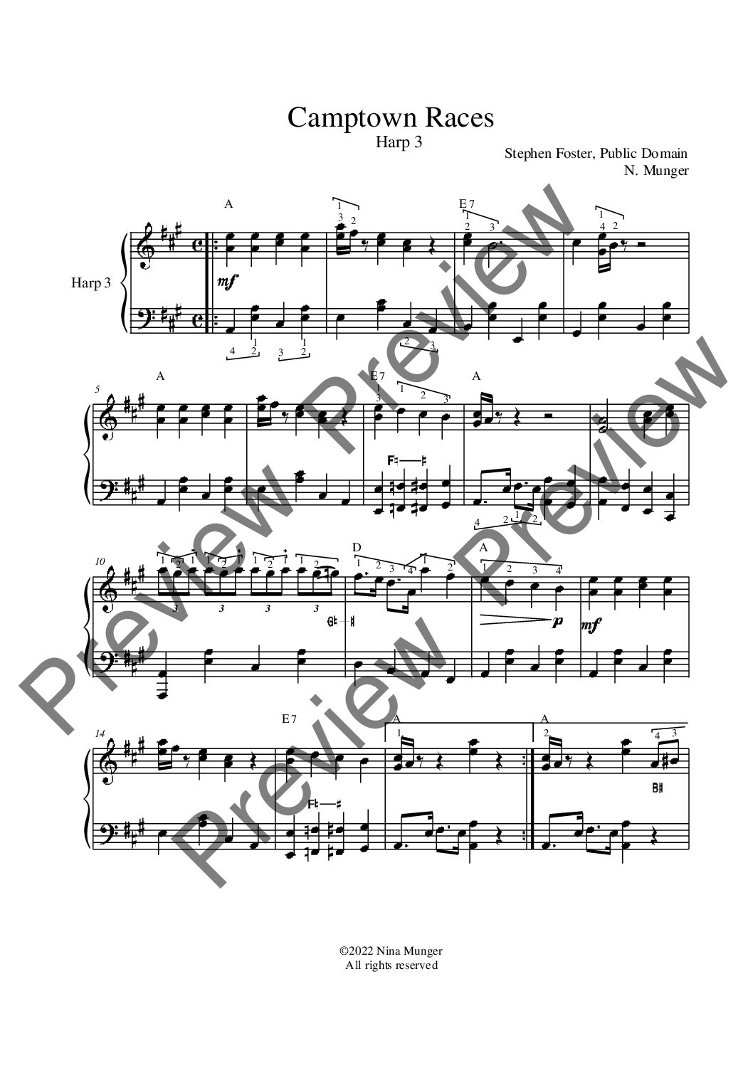 Part 3 is the melody of the tune. Part 4 was created solely as a backup so harpists could fill out the four-harp ensemble with a traditional “Fiddle” / Bluegrass style accompaniment. Each part has chord names written above the measure for improvisation and/or fretted (guitar) instruments accompaniment ease. The full four-harp score is included.