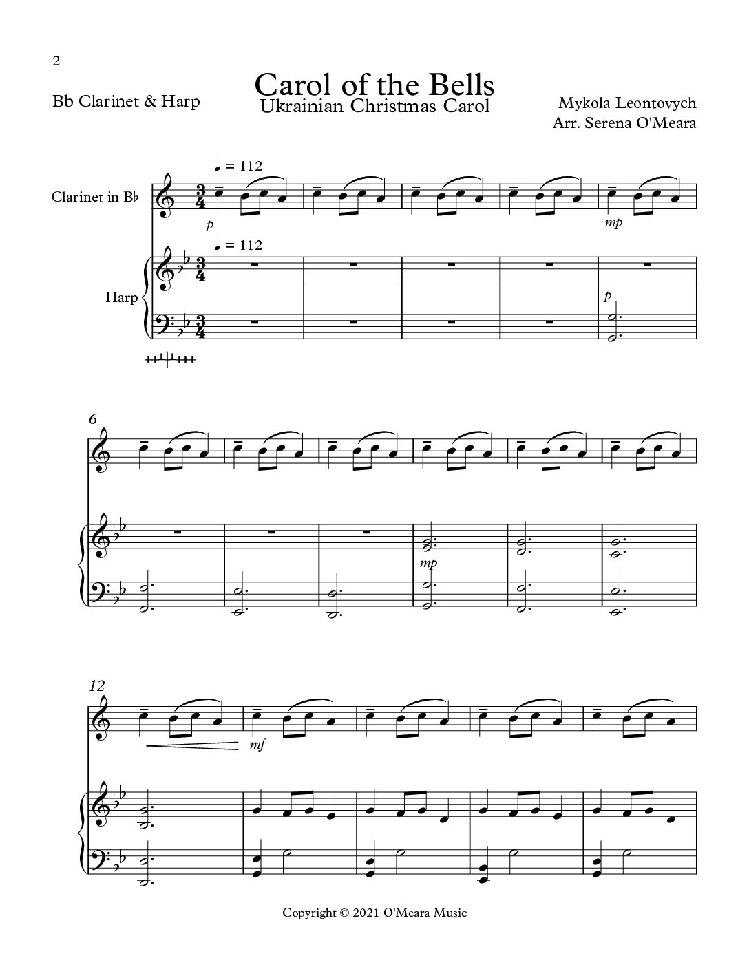 Carol of the Bells, Duet for Bb Clarinet and Pedal Harp
