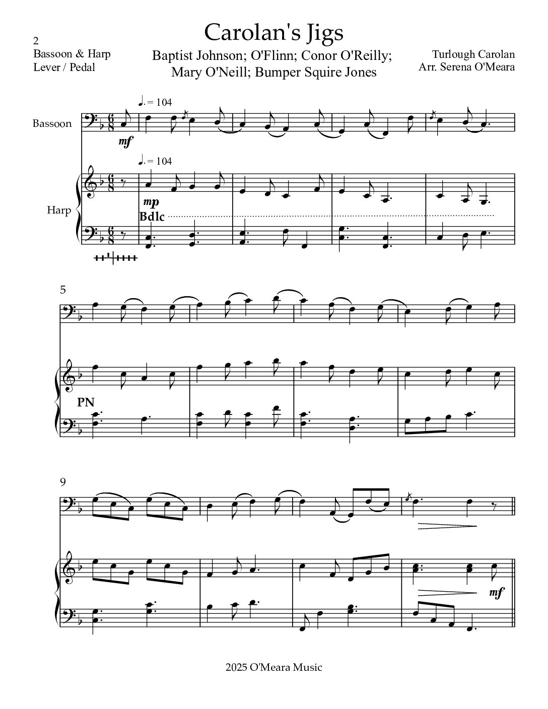 Five Carolan Jigs: Baptist Johnson; O’Flinn; Conor O’Reilly; Mary O’Neill (Carolan’s Favourite Jig); and Bumper Squire Jones (Thomas Morres). The medley progresses through 3 keys. Pieces can be played separately or as a medley lasting 3:45. The Harp part is playable on either Lever or Pedal Harps. You will receive the Score, plus separate Parts, 24 pages.