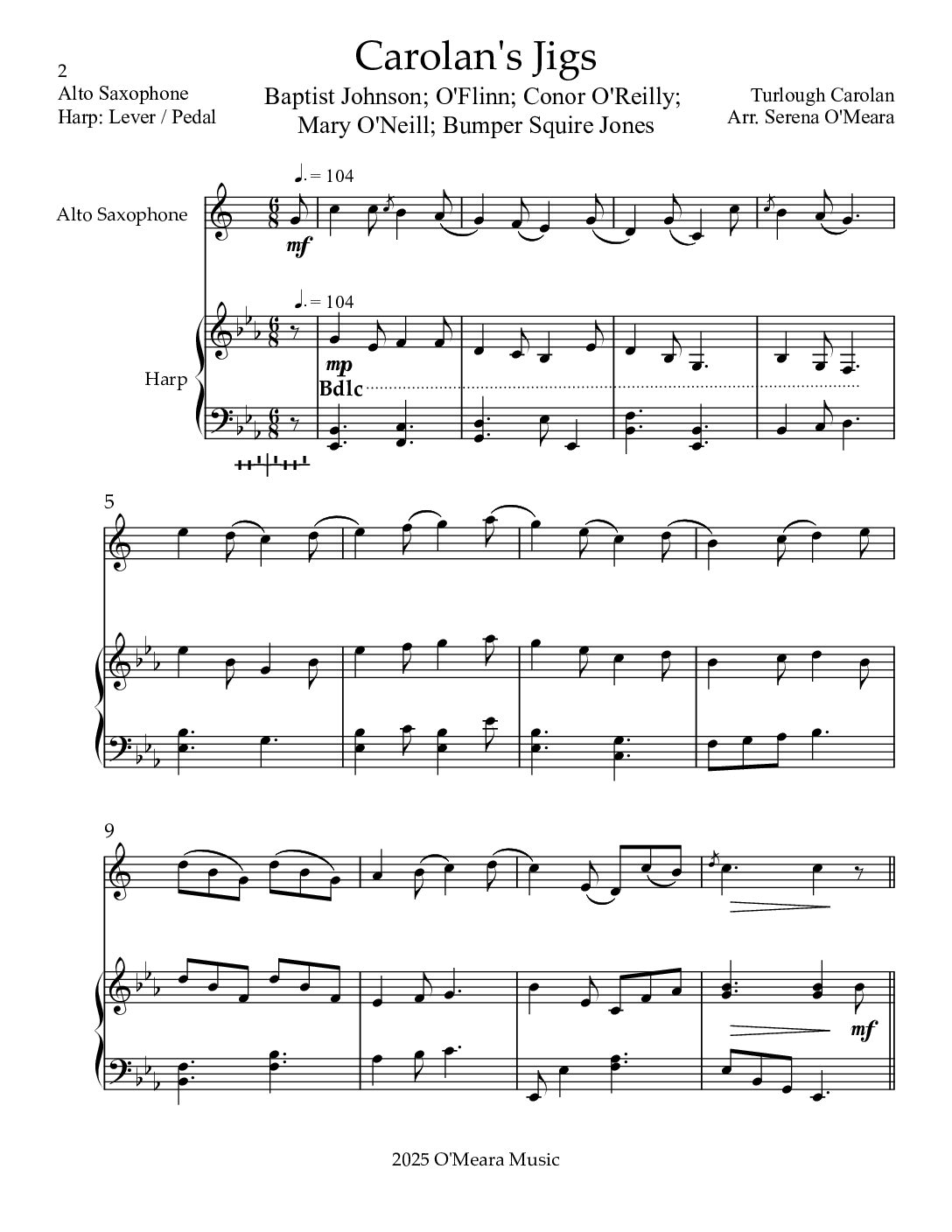 Five Carolan Jigs: Baptist Johnson; O’Flinn; Conor O’Reilly; Mary O’Neill (Carolan’s Favourite Jig); and Bumper Squire Jones (Thomas Morres). The medley progresses through 3 keys. Pieces can be played separately or as a medley lasting 3:45. The Harp part is playable on either Lever or Pedal Harps. You will receive the Score, plus separate Parts, 24 pages.