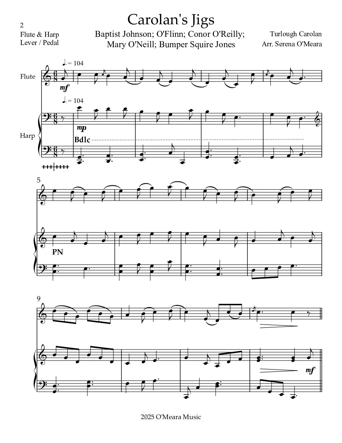 Five Carolan Jigs: Baptist Johnson; O’Flinn; Conor O’Reilly; Mary O’Neill (Carolan’s Favourite Jig); and Bumper Squire Jones (Thomas Morres). The medley progresses through 3 keys. Pieces can be played separately or as a medley lasting 3:45. The Harp part is playable on either Lever or Pedal Harps. You will receive the Score, plus separate Parts, 24 pages.