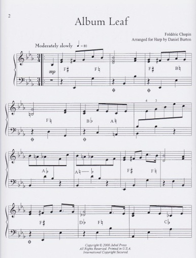Volume 2: Four lovely pedal harp arrangements in keys of Eb, F minor (four flats), C minor (three flats), and A minor (no sharps or flats). The accidentals are clearly marked, some melody in left hand, triplets, and meter changes. 12 pages. Intermediate Pedal Harp. Selections are pictured above.