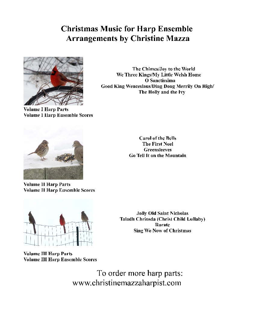 ALL HARPS – MINOR ADAPTING – INTERMEDIATE Traditional carols arranged for 2, 3, and 4 harps. Most of the titles are free from lever/pedal changes, therefore playable on lever harp. There are a very few pedal canges in the piece “Rorate” and these can easily be adapted for lever harp. Table of Contents: