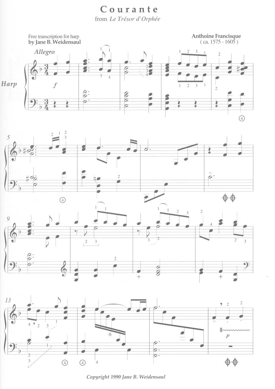 A sought after pedal harp transcription of a 16th century dance from a collection of 70 lute pieces called “Le tresor d’Orphee: livre de tablature de luth”. This collection was dedicated to the Prince of Conde to whom Francisque was in service. Ms. Weidensaul’s arrangement is imminently playable on the pedal harp, and of intermediate difficulty. The piece has been recorded by Nancy Allen and Susann McDonald, and gains increasing popularity. We receive calls from harpists and brides all over the country requesting this piece. It is a lovely recital piece, and makes a marvelous wedding processional. It is in the key of F with just a few pedal changes and close to the soundboard special effects to imitate the sound of the lute. INTERMEDIATE PEDAL HARP