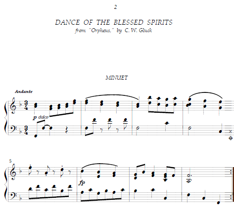 A very beautiful and evocative piece in D minor, and how nice that the harpist can play the melody and harmony both at the same time! This version contains both the Minuet, which is very simple to play (in the key of F and adaptable for lever harp), as well as the the Dance, which is not so easy. Usually played as a flute/harp duet, here it is presented as pedal harp solo. There are quite a few pedal changes, ornamentation in the right hand requiring good technique. Left hand is busy. INTERMEDIATE, PEDAL HARP.