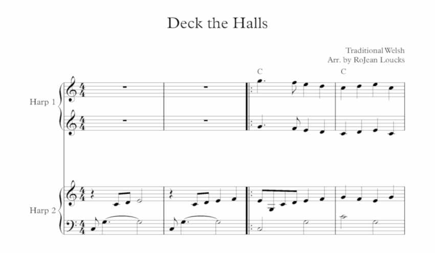 A simple arrangement of a holiday favorite for two harps, or harp ensemble. Harp 1 is easier – just the melody in both right and left hands. Harp 2 is an early-intermediate-level accompaniment. Chord symbols are given; works well for guitar addition to the ensemble. Key of C with no lever changes. Included are a full score and separate parts. ALL HARPS, VARIOUS LEVELS.