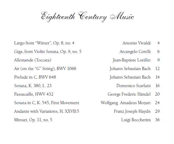 Contains: Largo from “Winter”, Op. 8, no. 4, Giga, from Violin Sonata, Op. 9, no. 5, Allemande (Toccata), Air (on the “G” String) from Orchestral Suite in D, BWV 1068, Prelude in C from “The Well-Tempered Clavier”, BWV 648, Sonata, K. 380, L. 23, Passacaille, HWV 432, Sonata in C, K. 545, First Movement, Andante with Variations, H. XVII:5, Minuet from String Quintet, Op. 11, no. 5.