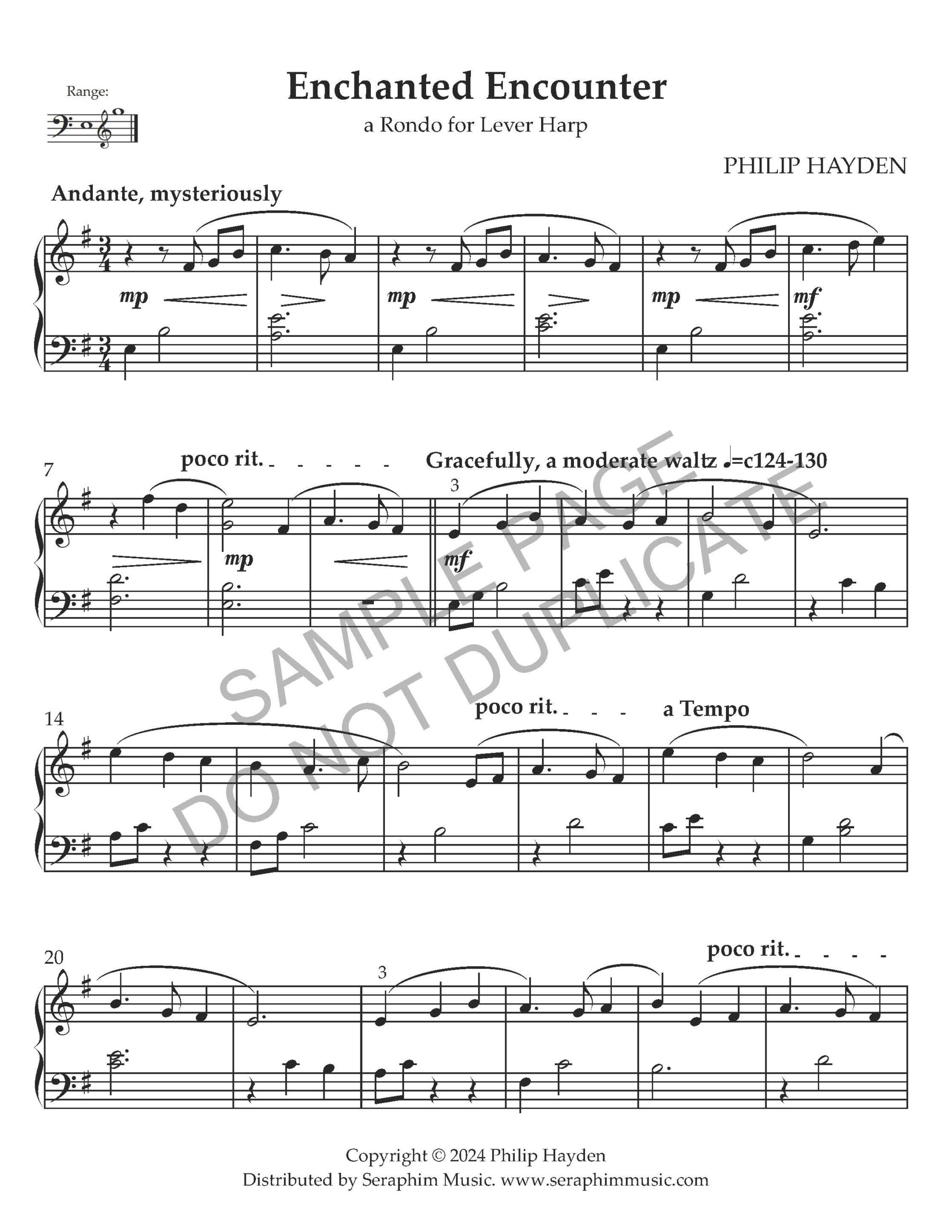 Enchanted Encounter – An original work by Philip Hayden. This evocative piece suggests visions of romantic encounters in faraway times and places. In the key of E minor, for lever or pedal harp, with no accidentals. Designed at an intermediate beginner level, and useful for a variety of situations.