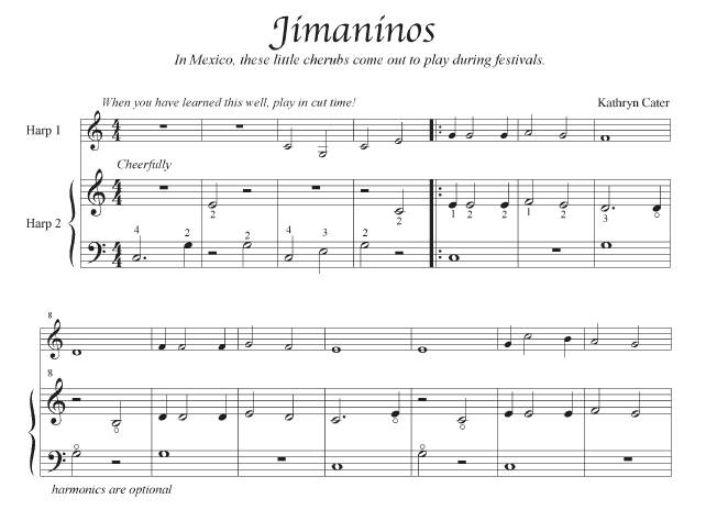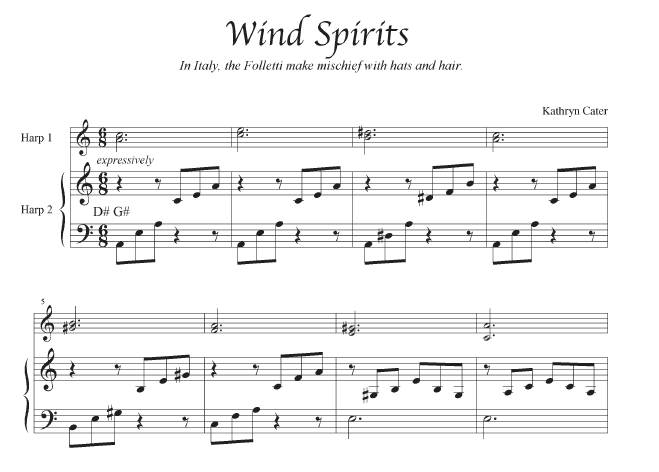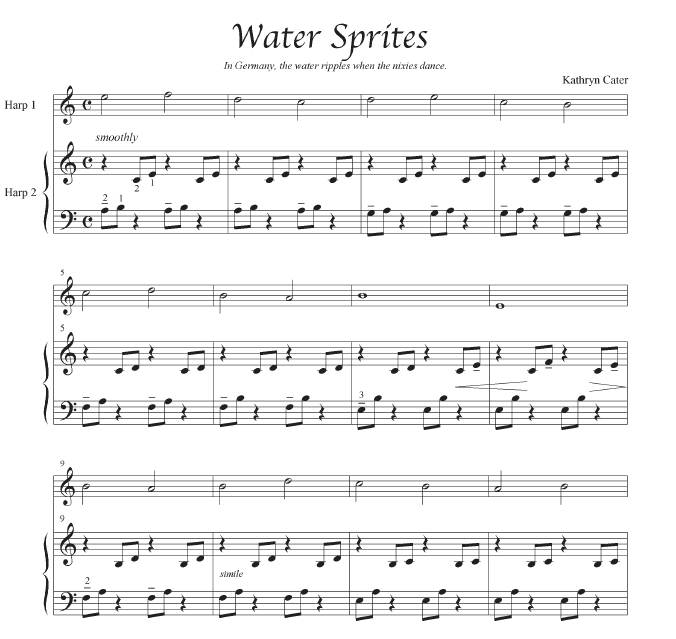 Eight enchanting duets, with a fantasy theme that includes mythical characters from different cultures around the globe. Includes two separately spiral-bound books. Harp two contains the score, which is a lovely and easy accompaniment for Harp 1. Harp 1 is very easy, and consists of melody only. The Harp 1 part can also be played by flute or violin. These pieces are fun and simple, involving no lever changes or tricky rhythms, and would be great for beginning and lower intermediate harpists, or for a teacher and student to play together. Easily adaptable for small harp. Some pieces feature glisses, or interesting pre-set accidentals for a fun twist! 17 pages, BEGINNER TO LOWER INTERMEDIATE, ALL HARPS.