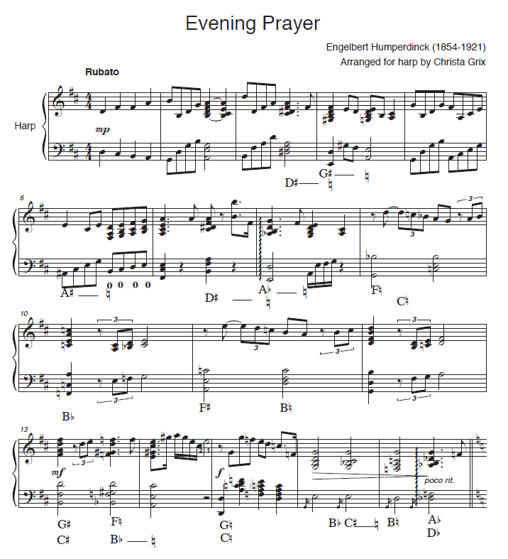 Engelbert Humperdinck wrote the opera Hansel and Gretel as a favor to his sister, who had written a libretto based on the fairy tale by the Brothers Grimm. Hansel and Gretel premiered in December, 1893, and has been associated with Christmas time ever since. Abendsegan (“Evening Benediction”) is the most famous piece from the opera, and is as beloved today as it was when it premiered. It is a charming folk melody that is suitable as a building block for jazz interpretation. I’ve written out an improvisation for the harpist to use, but an ambitious harpist could improvise over measures 18 – 35, before taking the coda at measure 36. Harmonics are played on the string where written, sounding an octave higher. As is typical for harp music, all chords are slightly rolled. However, when the rolled chord sign is indicated before a chord, that chord should be rolled more slowly than usual.