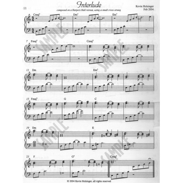 - Interlude – Key of C, two lever changes (one up, one down), 1 page, C’ to g’ (26-string would work), lower intermediate, mostly arpegiated 7th chords in left hand with 3rds in right hand, a bit of syncopation
