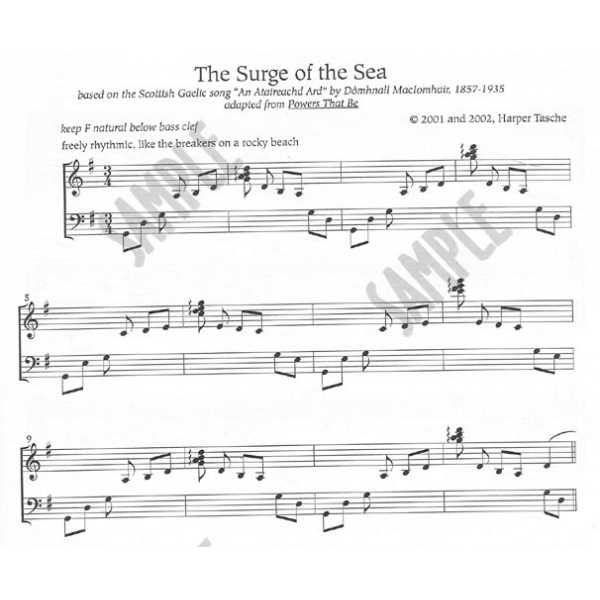Originals and arrangements of time-honored pieces for a 36-string folk harp without lever changes. These are pieces that Harper has recorded with the cross-strung. He adapted them to “get around” the accidentals so diatonic harp folks can enjoy playing them, too. Titles are: Dancing With Franz (a medley of two Schubert pieces plus an original waltz), Rosa das Rosas (medieval Spanish), Lady Dillon (Carolan, set as an early Baroque sonata, in two keys), The Summer Country (an original piece, a very poignant lament), October’s Rose (an original reel with quarter string harmonics), and The Surge of the Sea (a lush setting of a Scots Gaelic song). INTERMEDIATE LEVER HARP.