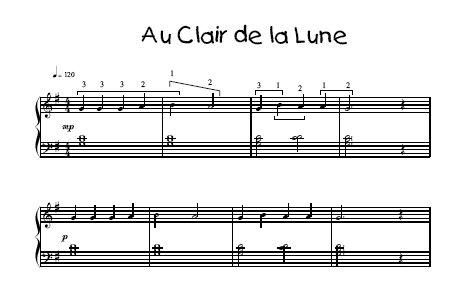 Alouette, Au Clair de la Lune, Cuckoo, Galway Piper, Hush Little Baby, Love Somebody, Lavender’s Blue, Lightly Row, London Bridge, Mary Had a Little Lamb, Muffin Man, Sarasponda, Sur le Pont d’ Avignon, This Old Man, Twinkle Little Star, Twinkle Variations, Yankee Doodle