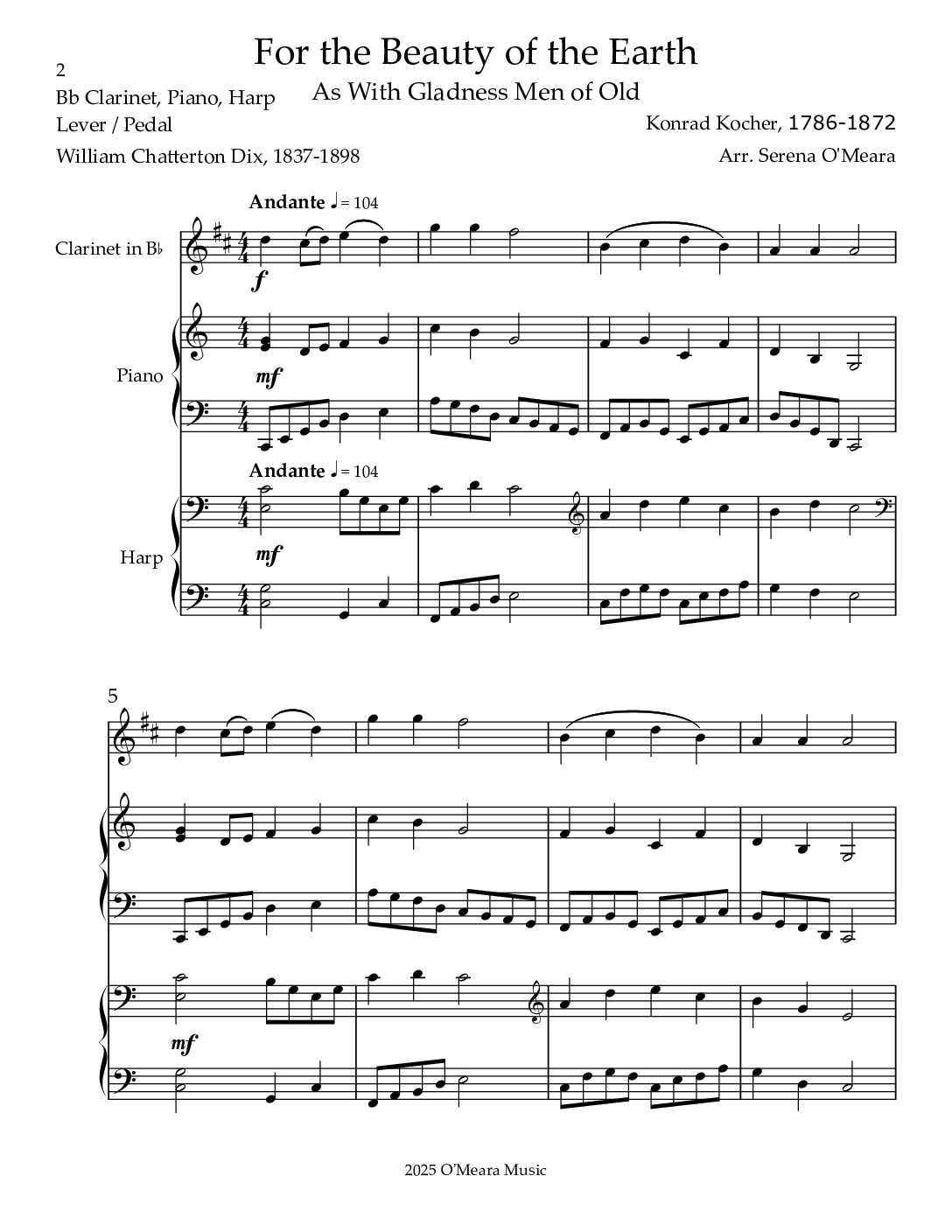 The lyrics to the German Epiphany hymn, As With Gladness Men of Old, were penned in 1859. They were set to a melody named “Dix” written in 1838 by Konrad Kocher. In 1864 Englishman, Folliott Pierpont penned the words “For the Beauty of the Earth”, setting them to the same melody. Score & Parts, 21 pages