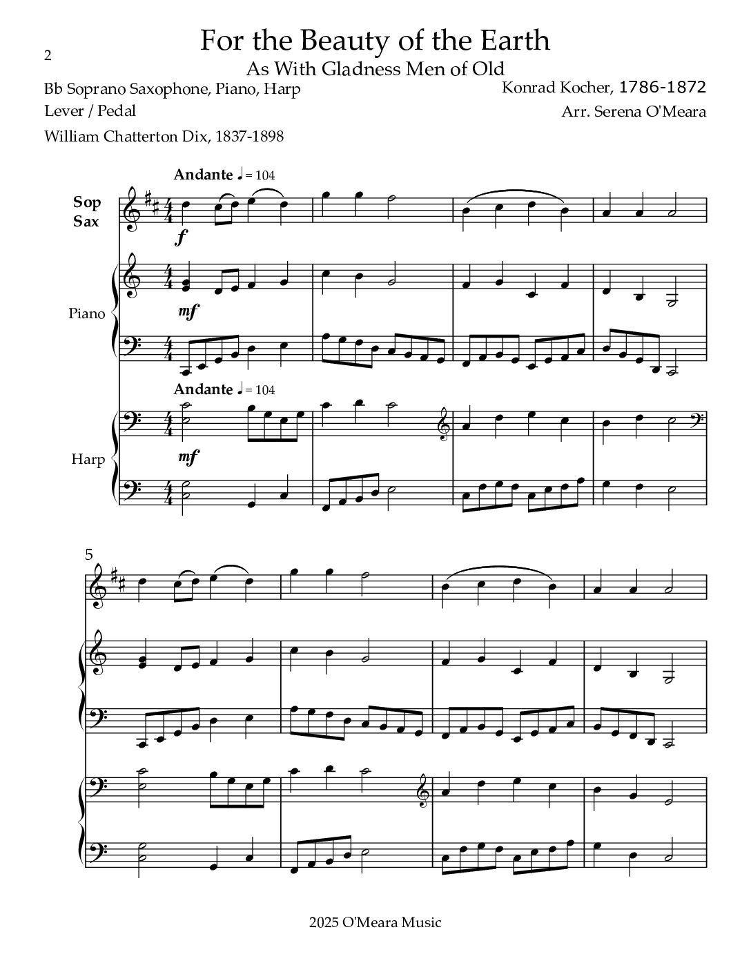 For the Beauty of the Earth, Trio for Bb Soprano Saxophone, Piano & Harp