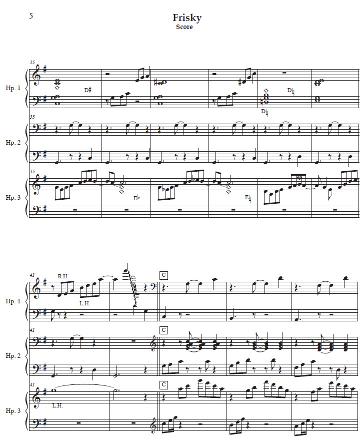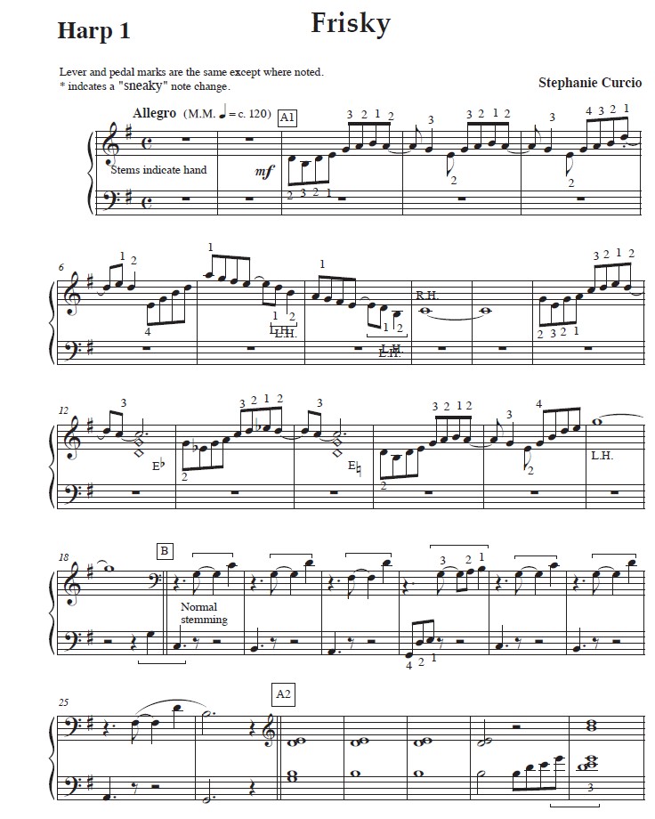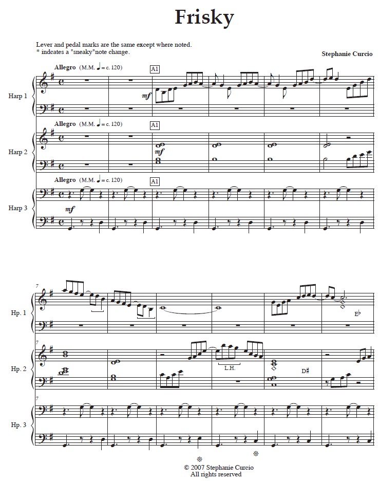 INTERMEDIATE, ALL HARPS TRIO.  An exciting romp through jazz rhythms and chords composed by Stephanie Curcio for three lever or pedal harps.  This is the companion piece to Stephanie’s more difficult jazz trio and duet Mischief.