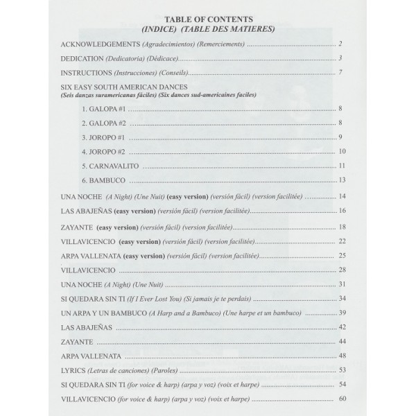 Table of Contents:Galopa #1, Galopa #2, Joropo #1, Joropo #2, Carnavalito, Bambuco, Villavicencio, Una Noche, Si Quedara Sin Ti, Un Arpa Y Un Bambuco, Las Abajenas, Zayante, Arpa Vallenata, Si Quedara Sin Ti, Villavicencio