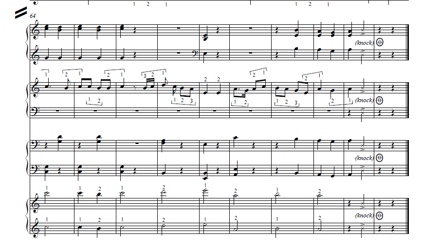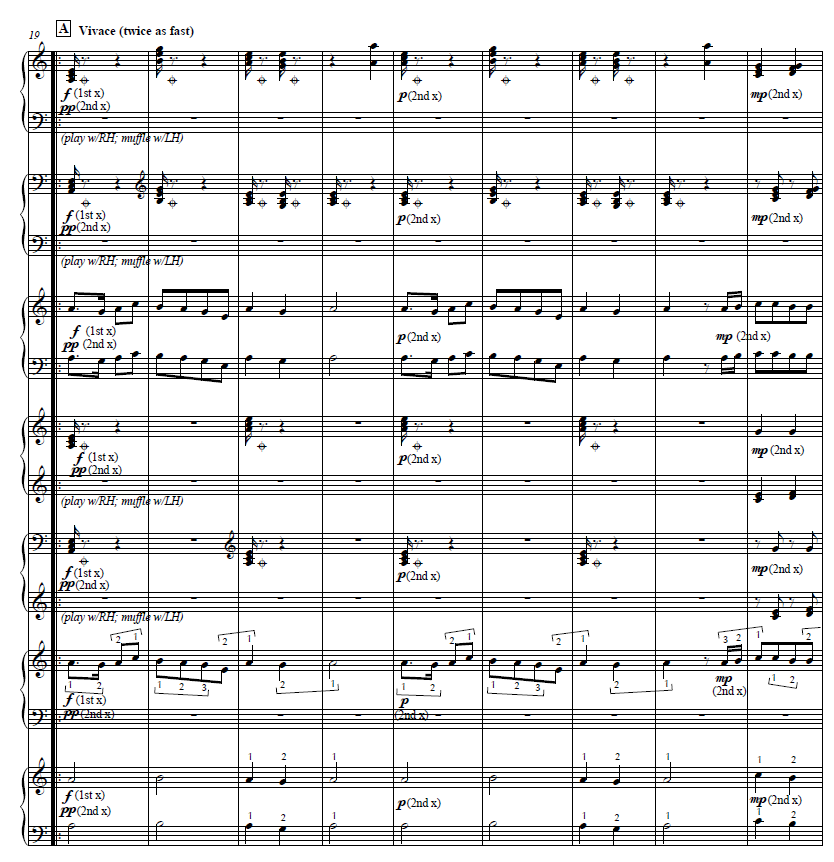 Vivace!  With timpanic sounds and quick silences.   Some full chords, some easy melody lines.  A good variety for an ensemble.