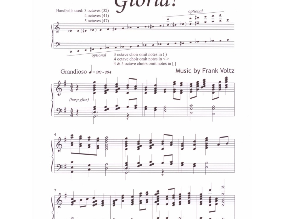 The original “Gloria” was composed for solo harp (lever or pedal), but Mr. Voltz heard it in his head with handbells. When the New Philadelphia Moravian Church handbell choir commissioned him to create a piece of music, he was thrilled to take the opportunity to arrange this piece for harp and handbells. It is for pedal harp with minimal pedal changes but is also playable on lever harp if one leaves out the accidentals. Those notes are already covered by the handbells. The set only comes in a package which includes conductor’s score, harp part, and 11 handbell parts. The parts are not sold separately. You can download the live performance by clicking on the download tab. Enjoy!!