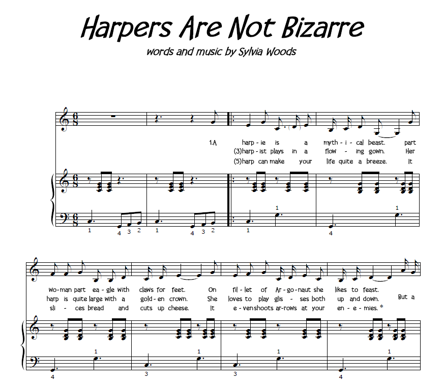 Sylvia Woods has used her humorous composition as an encore at the end of her concerts ever since she wrote it in 1982. The silly chorus Harpers are not bizarre. . . doot, doot, doot, doot is easy for audiences to learn and sing along. The verses talk about harpies, Harpo, harpists, harpers, and fun things you can do with your harp (such as “cut up cheese!”) At the end of the last verse, you’ll shoot a rubber-tipped arrow off of one of your harp strings!