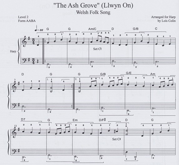 Eleanor Plunkett (with notes on how to play on 26-string harp), Gallagher’s Frolics (notes for 26-string harp), Morgan Magan, My Luve is Like a Red Red Rose, Annie Laurie, Hurree Hurroo, All Through the Night, Auld Lang Syne, The Ash Grove (three progressive versions for solo, duet or trio playing), Greensleeves (two progressive versions for solo or duet playing), Barbara Allen (English version), Barbara Allan (Scottish version).