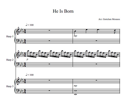 TRIO for 3 lever harps or 2P & 1L – your choice.  INTERMEDIATE:  Medley of He Is Born, the Divine Christ Child and Hark the Herald Angels Sing.  Scroll down for a video recording.