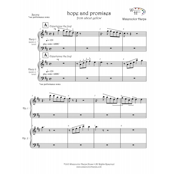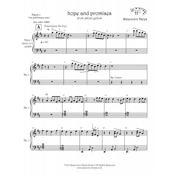 There are a few versions of the solo available and each can be played on a lever or pedal harp. The A version is advanced, the B version is intermediate, and C (with and without lyrics) is for beginners. Watch for lever slides in Hp. 1 — measures 61, 65 and 73, and in Hp. 2 — measure 61. Notes in ( ) may be omitted to accommodate lever changes. There are a few versions of the solo available. The A version is advanced.