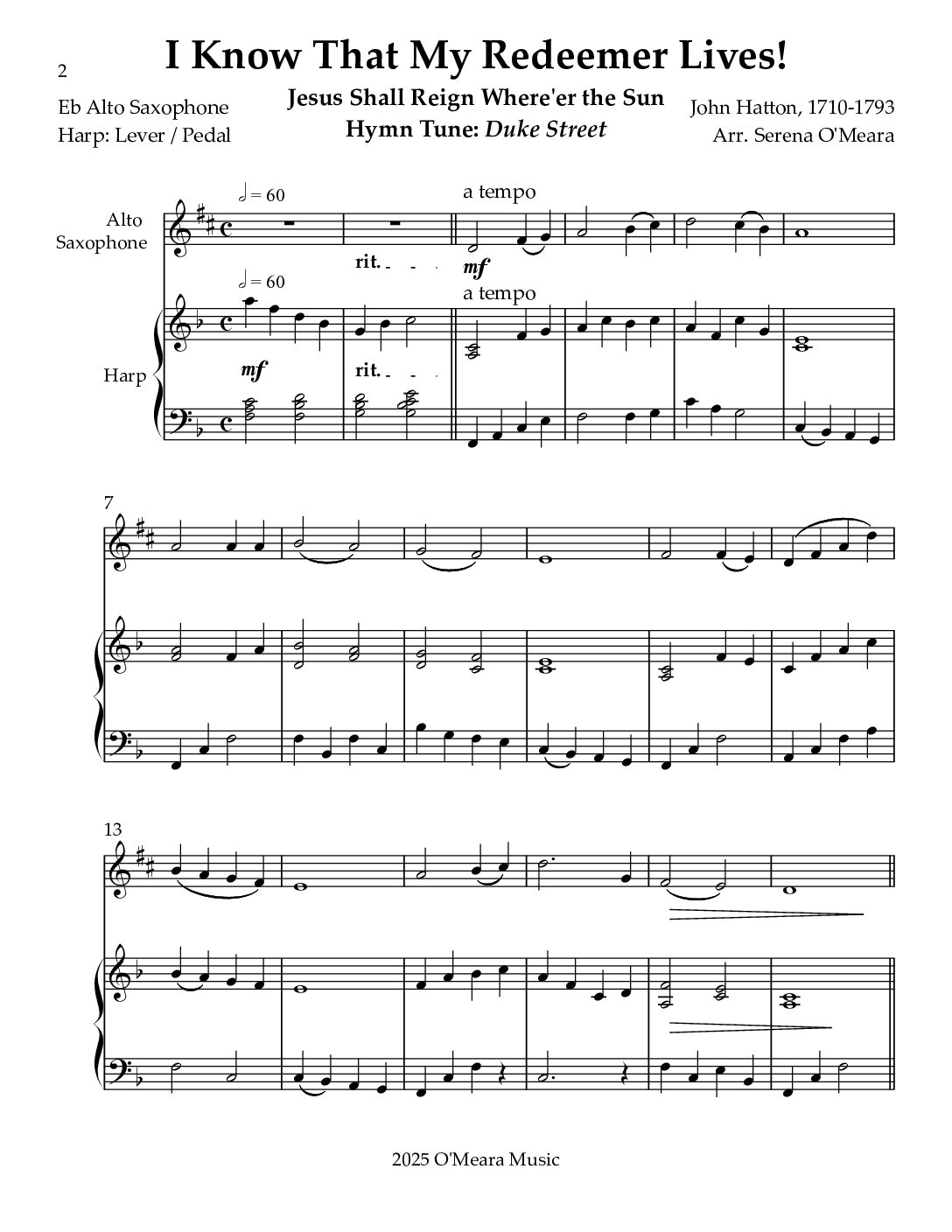 The hymn tune name, Duke Street, refers to the street composer John Hatton lived on in Lancaster, England. His melody has been used for many lyrics & titles. I Know that My Redeemer Lives! and Jesus Shall Reign Where’er the Sun are the most common hymns titles. Playable on Lever or Pedal Harps. Score and Parts, 13 pages.