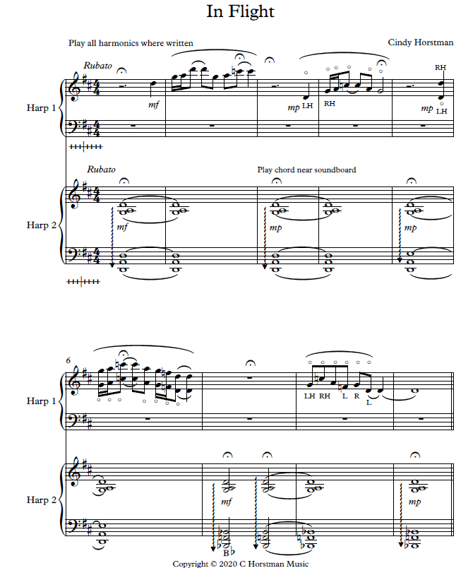 PEDAL HARP UPPER INTERMEDIATE TO INTERMEDIATE In Flight for 2 Harps; An original, upbeat, Latin Jazz feel that is fun to play!  It can be adapted for two lever harps.  The piece depicts kind of a weightless feeling.  It is also available as a solo.  Click HERE for the solo version. This title, either solo or duo version, is only available in PDF download format.