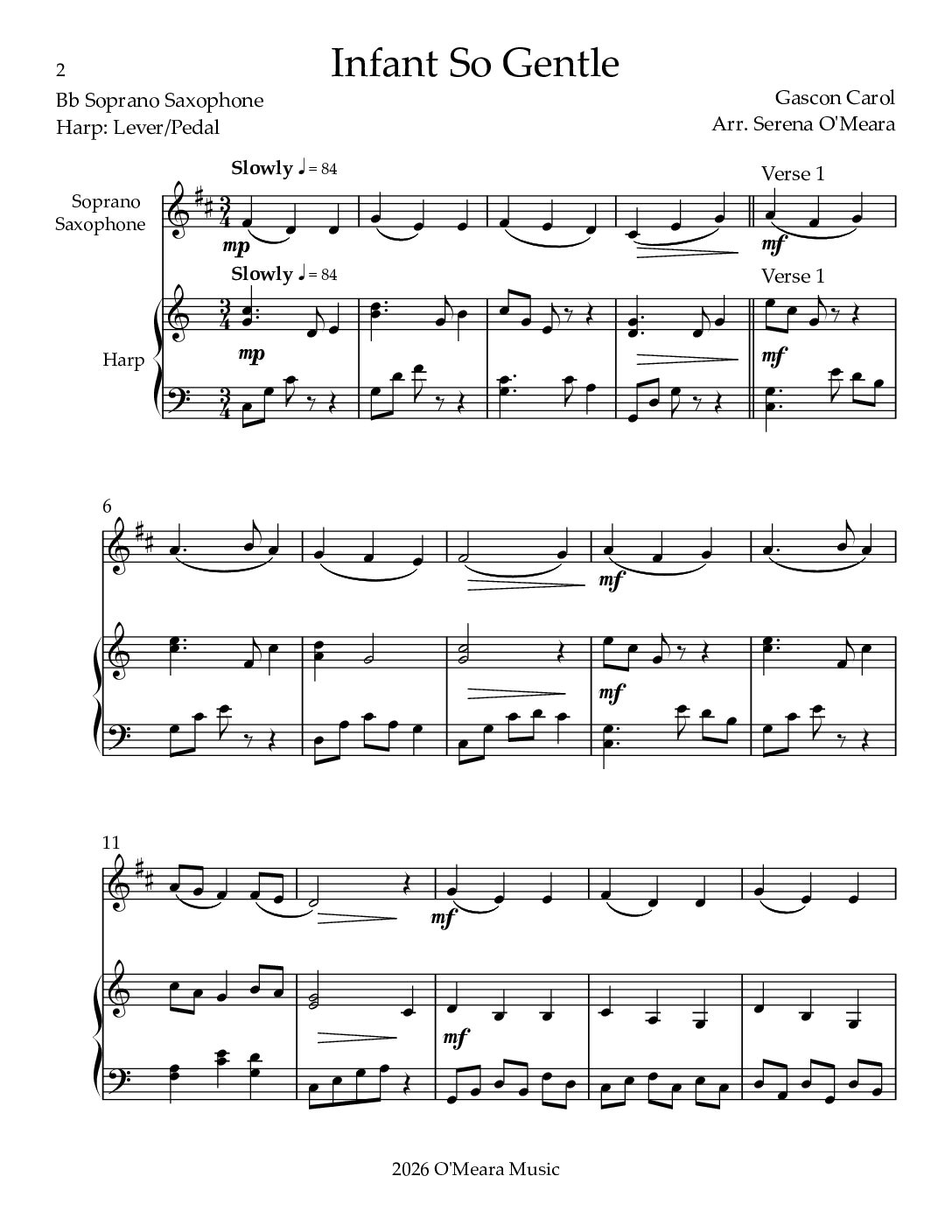 Infant So Gentle, Duet for Bb Soprano Saxophone & Harp