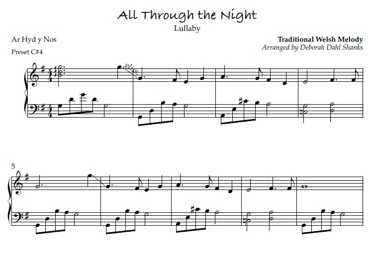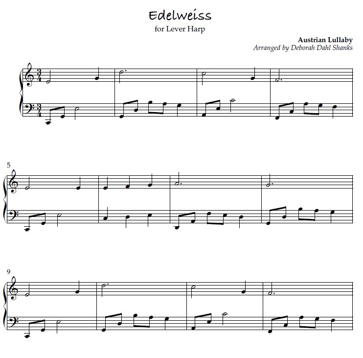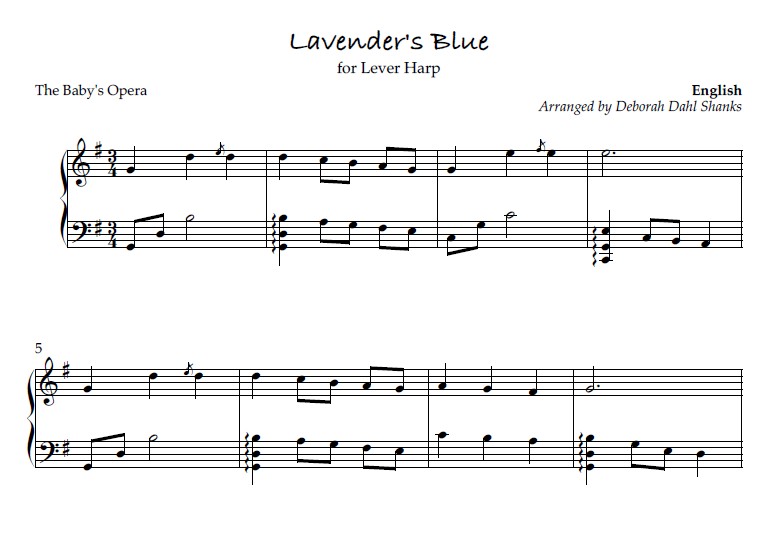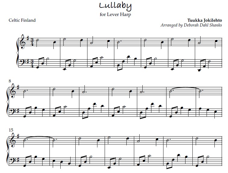 “International Lullabies for the Harp is a collection of 26 lullabies from the United Kingdom, Europe, Asia, the Americas and of Jewish origins. The arrangements are appropriate for a lever harp of 34-36 strings and with 2 octaves below middle C and tuned to Eb or C. All arrangements are very accessible for a mid-beginner to intermediate level player with limited or easy lever changes.”