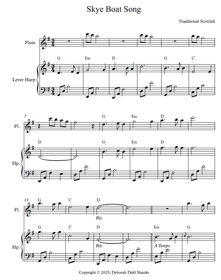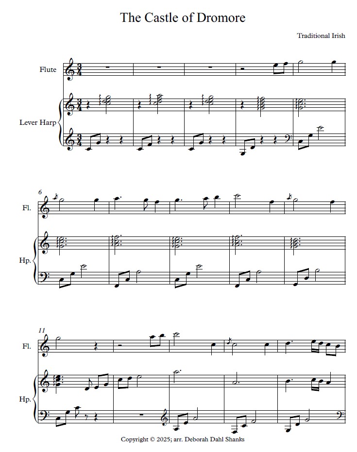 Appealing to everyone with their charming lilt and mix of familiar and new melodies, these flute and harp duets are delightfully diverse additions to any gig or concert (especially one around March 17th!). The harp parts feature arpeggios and rolled chords (intervals up to a tenth), clever counter-harmony lines, and original introductions and interludes that engage the audience. Flutists will enjoy parts that foray beyond the simple melodies of the first verses into improvisational passages and occasional harmony to the harp’s melody.
