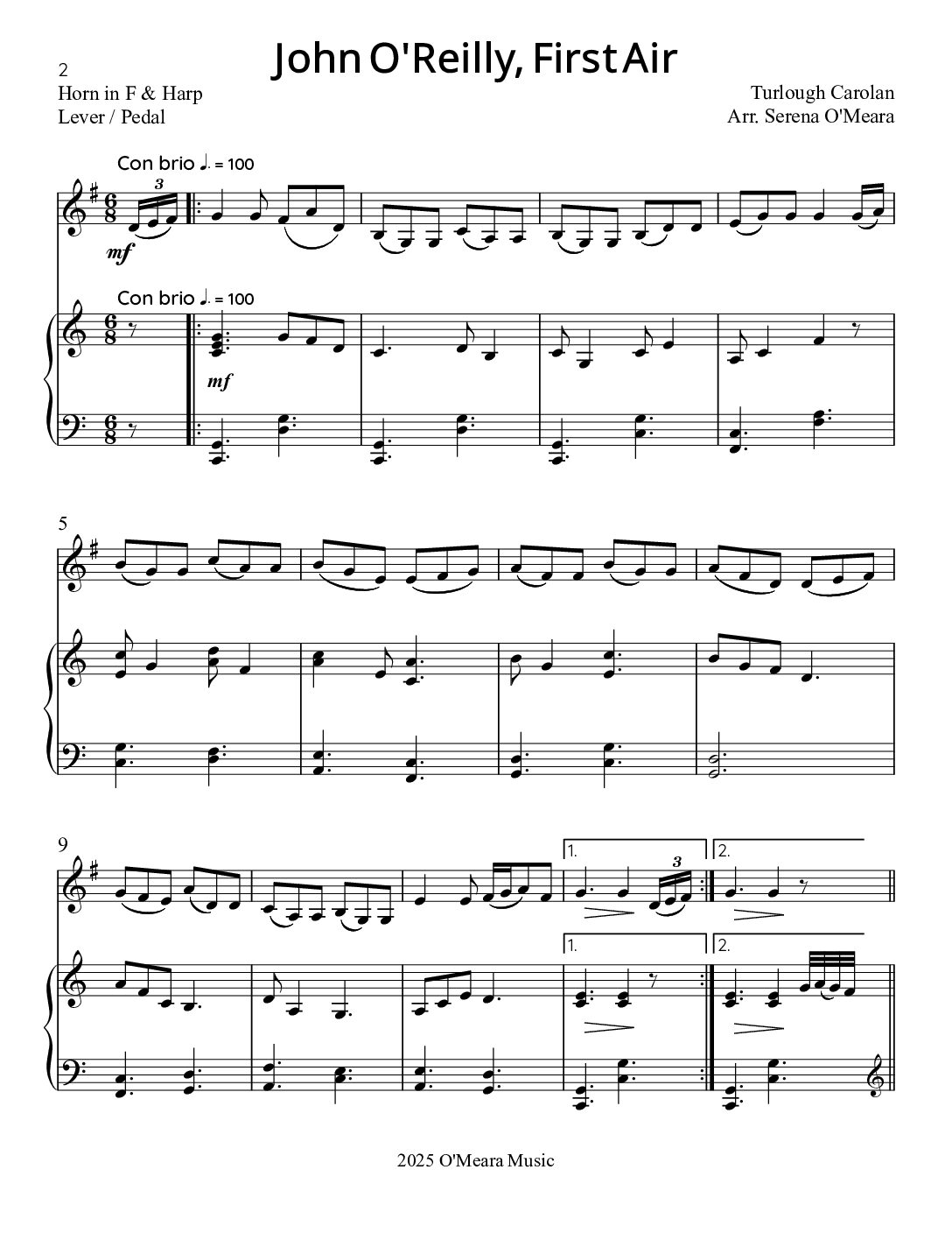 A spirited Irish Jig in honor of John O’Reilly of County Meath. You will receive the Score, plus separate Parts. The Harp part is playable on either Lever or Pedal Harps. Score & Parts, 15 pages.