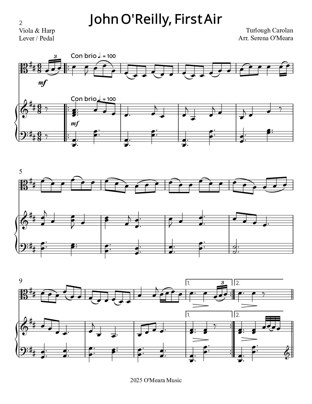 A spirited Irish Jig in honor of John O’Reilly of County Meath. You will receive the Score, plus separate Parts. The Harp part is playable on either Lever or Pedal Harps. Score & Parts, 15 pages.