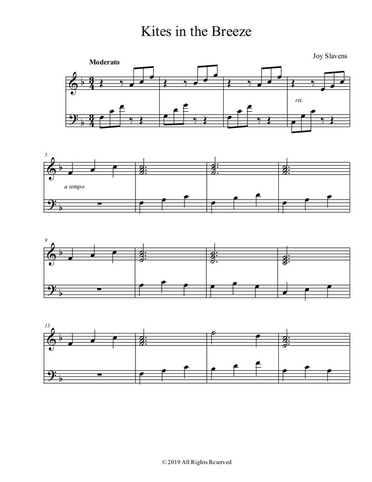 LOWER INTERMEDIATE TO INTERMEDIATE, ALL HARPS. A brand new harp solo written for a beginner harpist.  Kites in the Breeze teaches open 5ths, arpeggios, chords and more. Great for a teacher to use for adults or children.