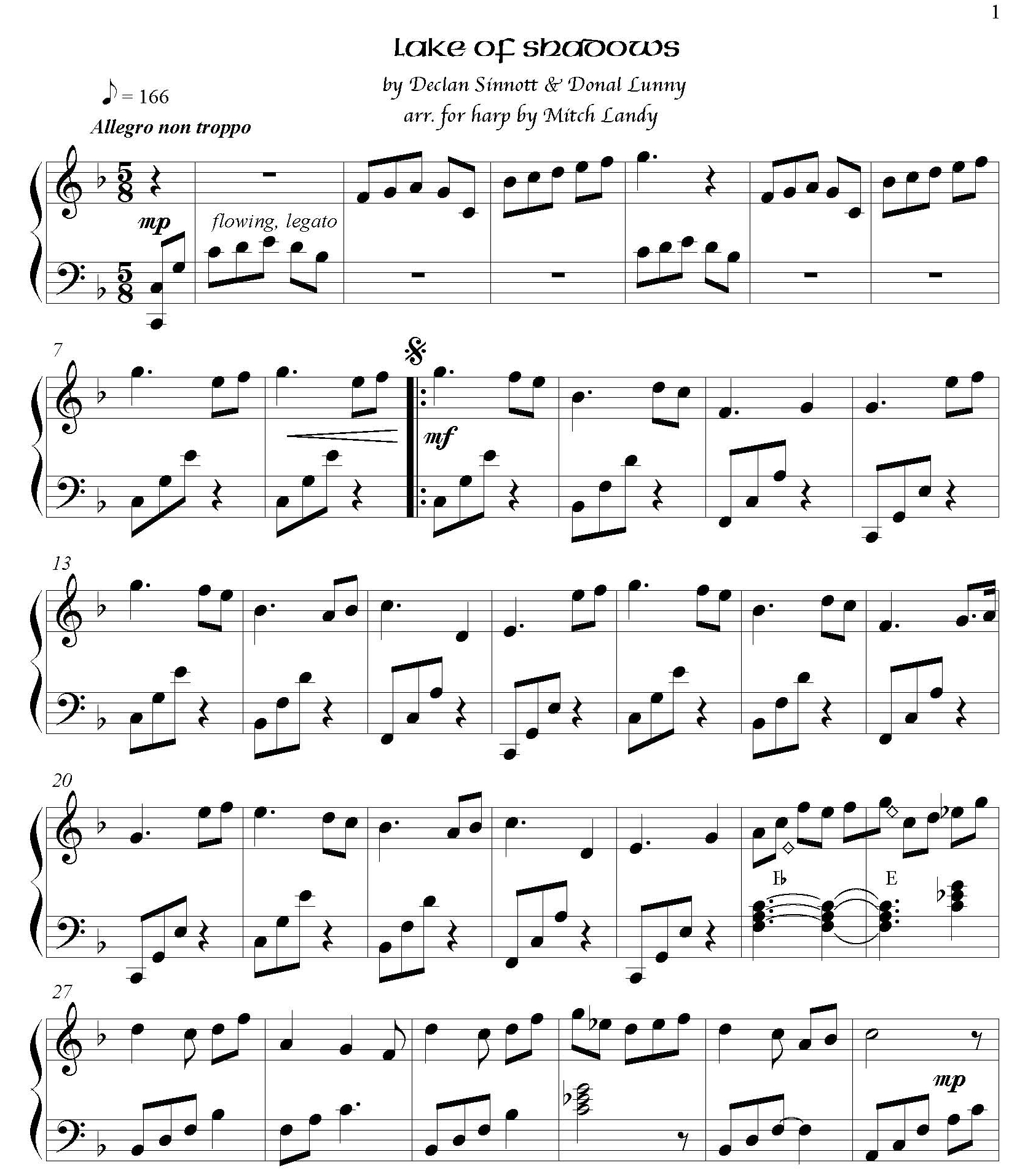 A contemporary Irish piece, in 5/8 time, by Declan Sinnott & Donal Lunny, of the (folk-rock) band Moving Hearts, arranged for lever or pedal harp. A few quick lever changes present the main difficulties of this easy intermediate piece, even easier for pedal harp; 3 pages. INTERMEDIATE, ALL HARPS