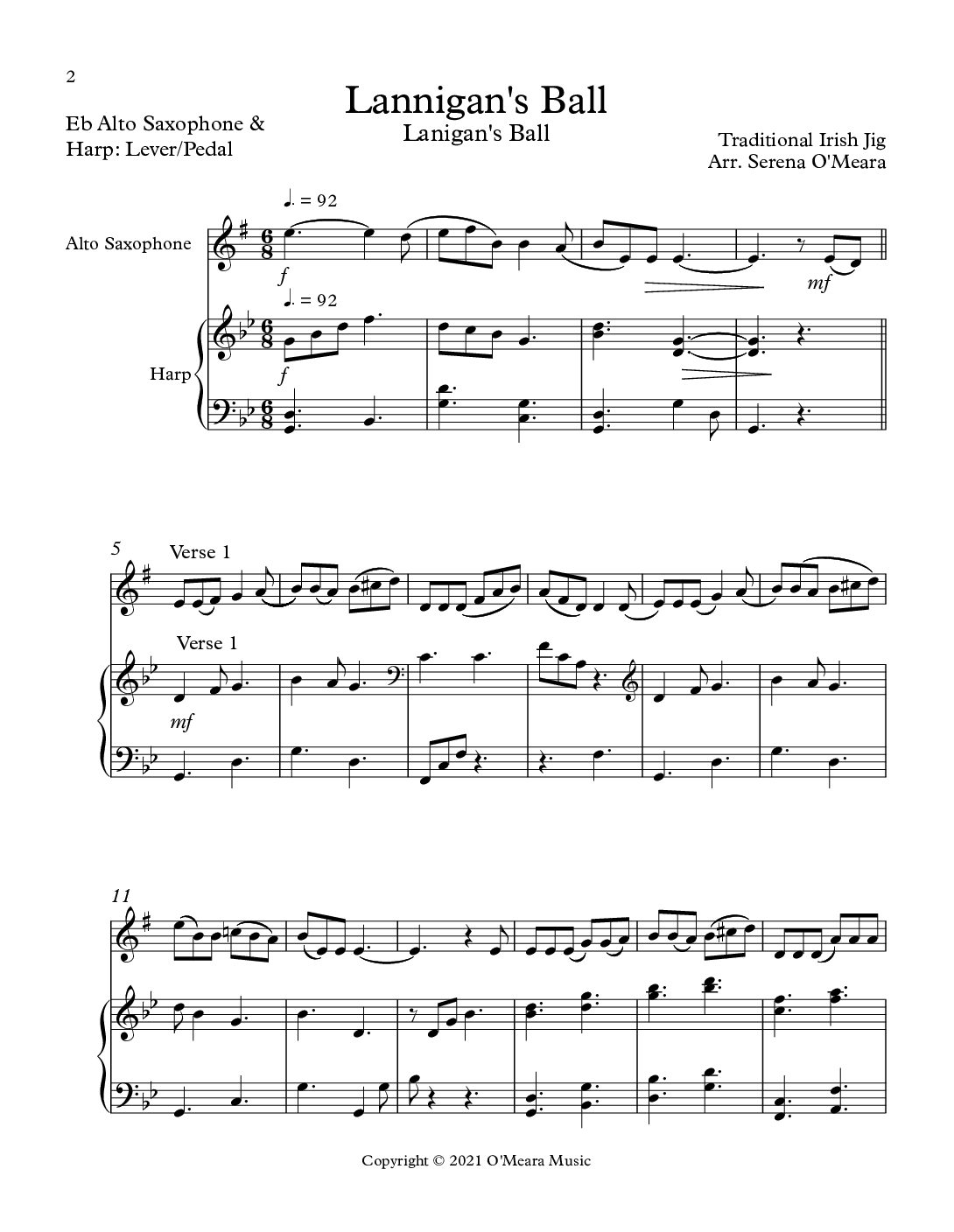 Lannigan’s Ball, Duet for Eb Alto Saxophone & Harp